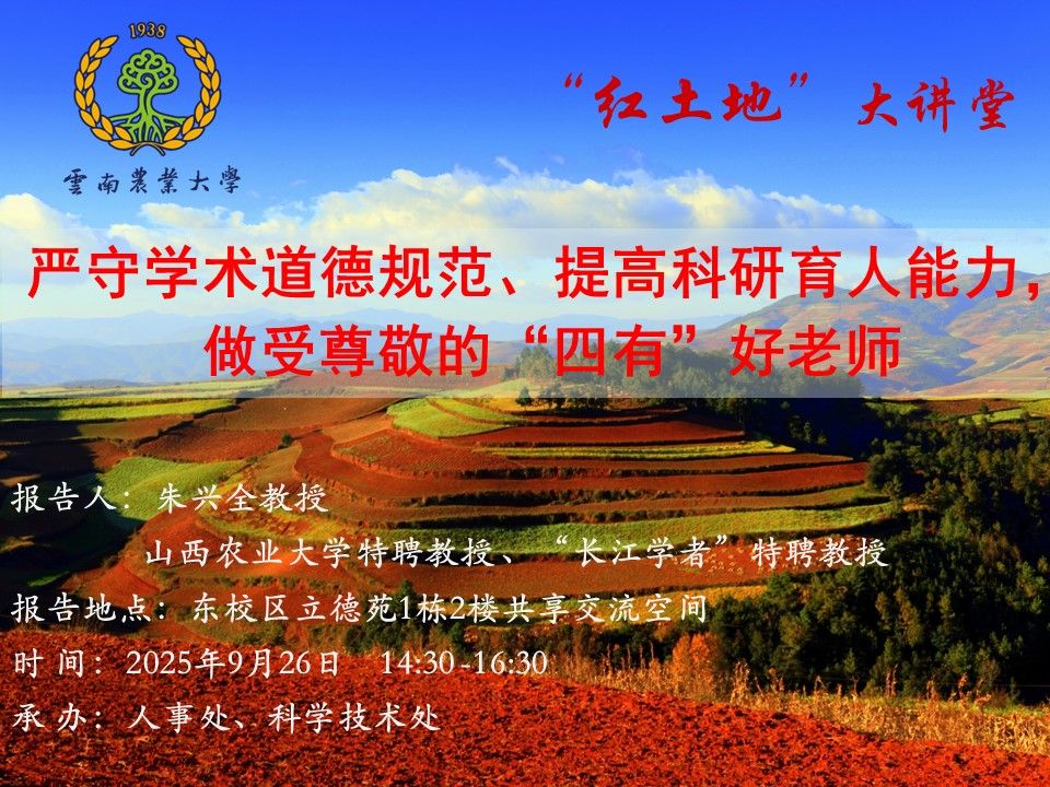 9月26日“红土地”大讲堂:严守学术道德规范、提高科研育人能力,做受尊敬的“四有”好老师