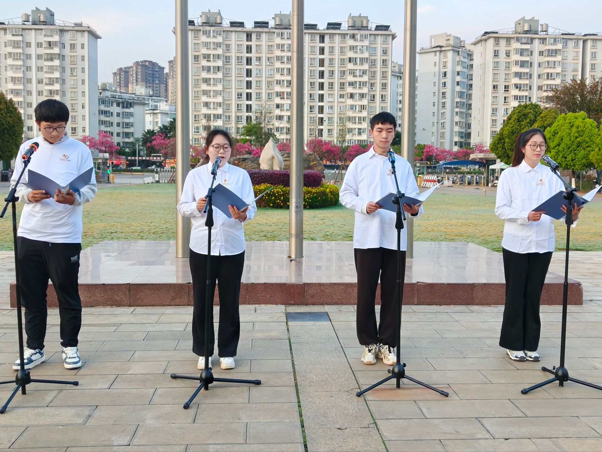 四位机电学子以“在国旗下集合 机电青年的回答”为主题带来深情激昂的诗朗诵。他们回顾学院五十余载办学积淀,表达投身智慧农业、攻关“卡脖子”技术、助力“中国智造”的坚定信念,展现了新时代机电青年学子的责任担当。铿锵誓言回荡在国旗周围,点燃了全场师生的报国热情。