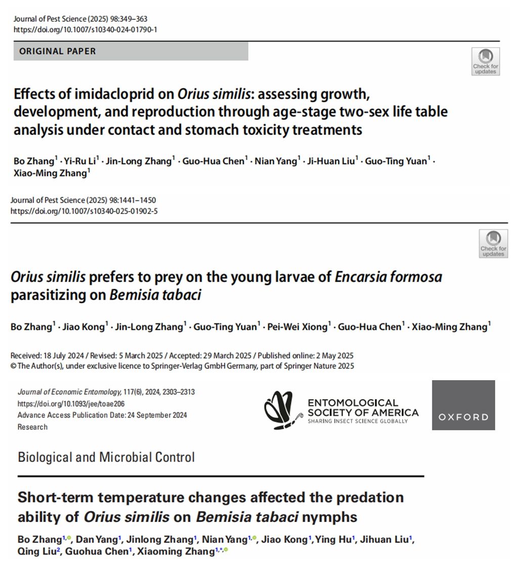以此次成果为切入点,张薄在硕士阶段围绕“非生物因子胁迫影响天敌昆虫控害潜能”和“天敌联合控害机制”等方向持续开展系统研究,取得一系列高水平成果。其中,以第一/共一作者在Journal of Pest Science、Journal of Economic Entomology等期刊发表SCI论文8篇(1区TOP期刊论文3篇),授权和受理发明专利2项。相关成果从杀虫剂胁迫、温度变化及温室条件下联合控害应用等方面,为农业害虫绿色防控提供了理论支撑和实践参考。
